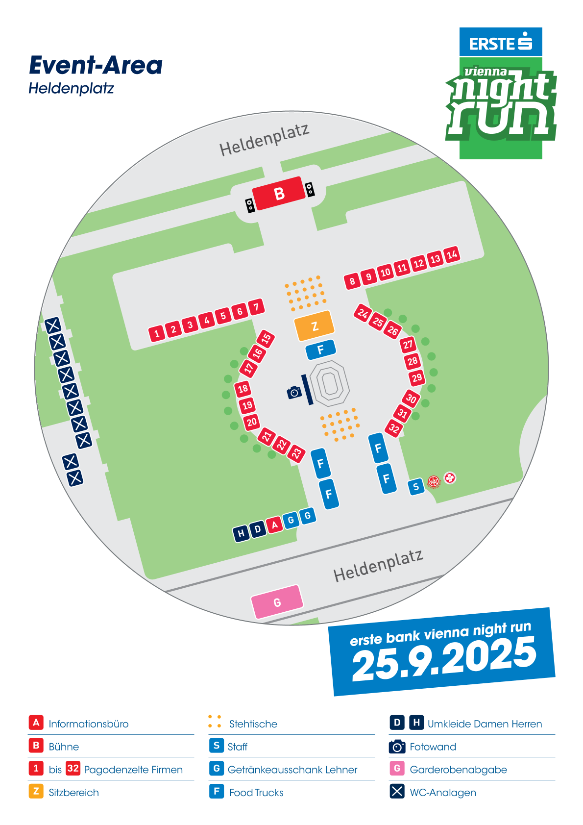 Du kannst dir jetzt schon den Plan für die Event Area am Heldenplatz ansehen und dich informieren, wo was aufgebaut sein wird. So bist du bestens vorbereitet und kannst nicht nur auf der Strecke zielsicher unterwegs sein, sondern auch am Weg zur Garderobe, zur Information oder zu den WCs.